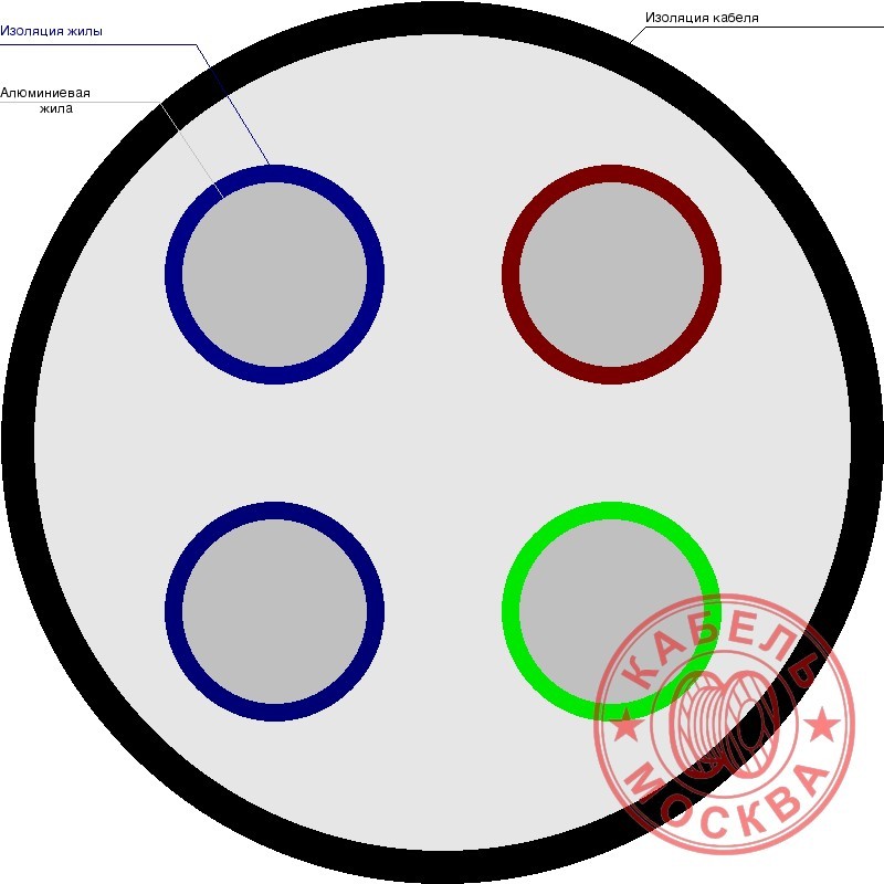 Силовой кабель АВВГнг 4х150+1х70 с ПВХ изоляцией отличается виниловой изоляцией, которая устойчива к щелочным, кислотным, минеральным и химическим воздействиям, низкой степени горючести. Силовой кабель представляет следующую структуру: алюминиевые однопроволочные или многопроволочные токопроводящие круглые или секторной формы жилы, которые изолируются цветным поливинилхлоридным пластикатом (голубой цвет у нулевых жил, желто-зеленый цвет у жилы заземления) и скручиваются (для 2ух-, 3х-, 4х-, 5ти-жильных кабелей). Двужильные кабели имеют жилы с одинаковым сечением. А в кабелях 3х-, 4х-, 5ти-жильных одна из жил имеет меньшее сечения (жила заземления или нулевая), в отличии от всех остальные жилы с одинаковым сечением. Сверху кабель покрывается поясной изоляцией из поливинилхлоридного пластиката низкой горючести и специальным заполнителем свободного межжильного пространства. Защитная бронь из стальных лент накладывается таким образом, чтобы ленты перекрывали друг друга, исключая свободные промежутки. Внешнее покрытие из поливинилхлоридного пластиката. Не распространяющий и не поддерживающий горения.