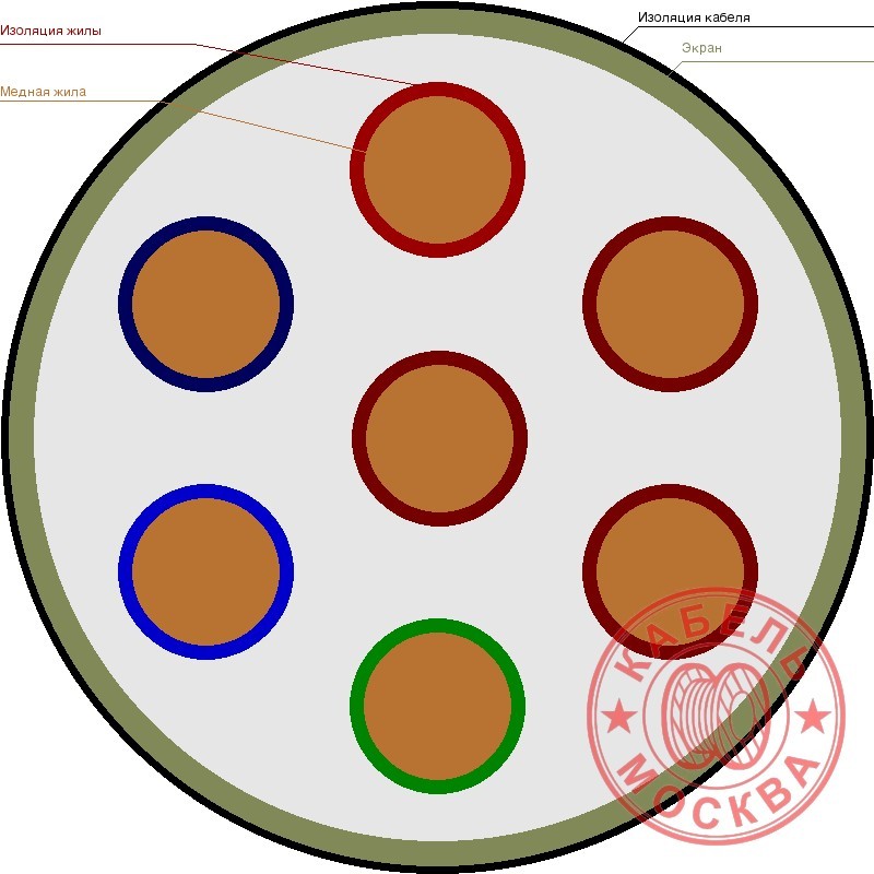 Контрольный кабель КВВГЭнг-FRLS 7х0,75 из состоит медной однопроволочной жилы, покрытой оболочкой из поливинилхвлоридного пластика. Сверху этот проводник покрывают подобные проводники такой же структуры, но отличающиеся цветовой оболочкой в соответствии с кодировкой. Они скручены повивом в несколько ярусов. Экран - фольгированный алюмофлекс Внешняя изоляция из поливинилхлоридного пластиката, которая выполняет защитную функцию, не распространяющая и поддерживающая горения, пожаробезопасен и взрывобезопасен.