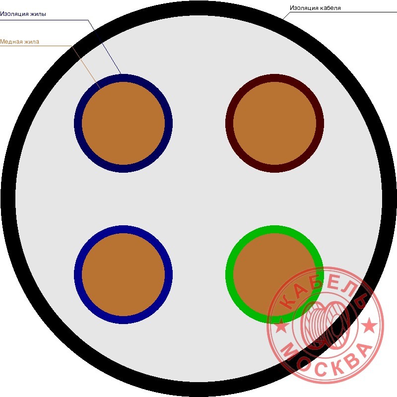 Контрольный кабель КВВГнг-LS 4х50 состоит медной однопроволочной жилы, покрытой оболочкой из поливинилхвлоридного пластика. Сверху этот проводник покрывают подобные проводники такой же структуры, но отличающиеся цветовой оболочкой в соответствии с кодировкой. Они скручены повивом в несколько ярусов. Внешняя изоляция из поливинилхлоридного пластиката, которая выполняет защитную функцию, не поддерживает горение, с пониженным дымо- и газовыделением.