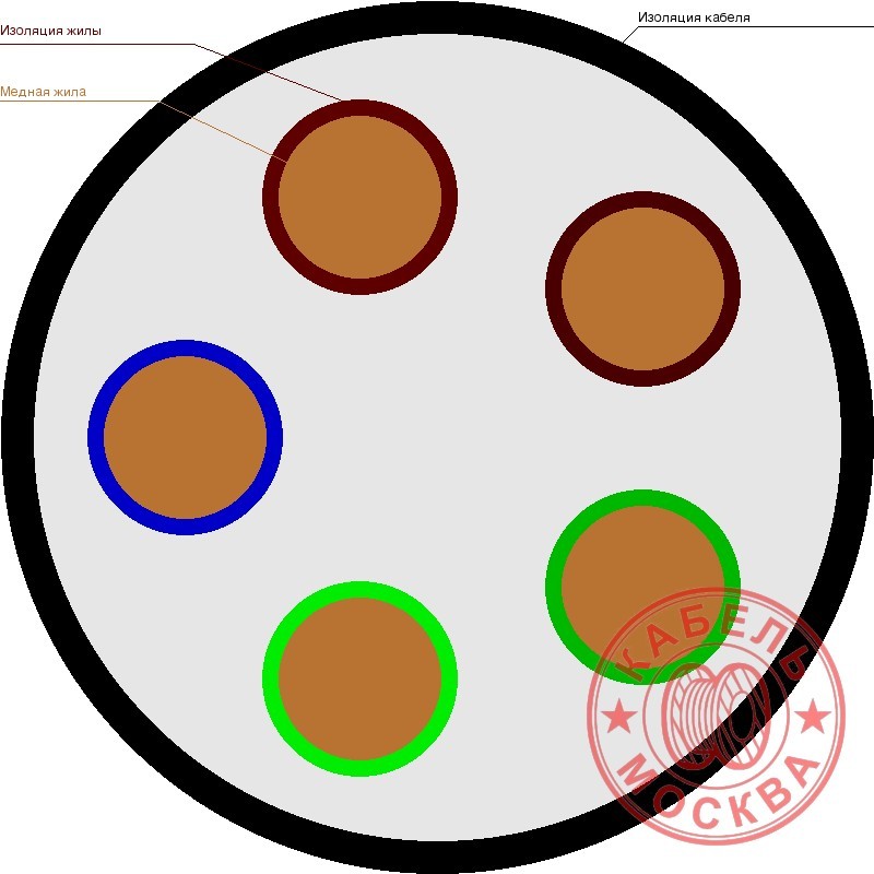 Силовой кабель ВВГнг-LS 5х95 с ПВХ изоляцией отличается виниловой изоляцией, которая устойчива к щелочным, кислотным, минеральным и химическим воздействиям, низкой степени горючести. Силовой кабель представляет следующую структуру: медные однопроволочные или многопроволочные токопроводящие круглые или секторной формы жилы, которые изолируются цветным поливинилхлоридным пластикатом (голубой цвет у нулевых жил, желто-зеленый цвет у жилы заземления) и скручиваются (для 2ух-, 3х-, 4х-, 5ти-жильных кабелей). Двужильные кабели имеют жилы с одинаковым сечением. А в кабелях 3х-, 4х-, 5ти-жильных одна из жил имеет меньшее сечения (жила заземления или нулевая), в отличии от всех остальные жилы с одинаковым сечением. Сверху кабель покрывается поясной изоляцией из поливинилхлоридного пластиката низкой горючести и специальным заполнителем свободного межжильного пространства. Защитная бронь из стальных лент накладывается таким образом, чтобы ленты перекрывали друг друга, исключая свободные промежутки. Внешнее покрытие из поливинилхлоридного пластиката низкой степени горючести и пожаро-, взрыво- безопасное.